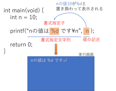 また、指定した書式指定子に適切な型(値)を持った変数を指定しなければならない。