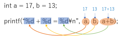 このように、printf関数では、引数の前半に“書式指定”、後半に書式指定で指定された書式指定子で値を表示する変数リストを並べる。