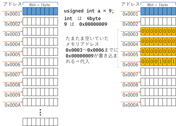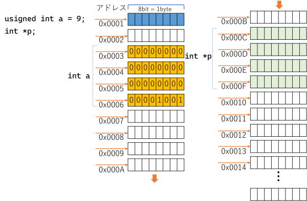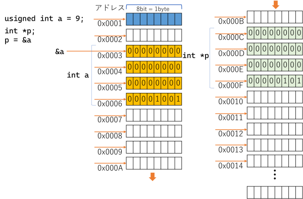 unsigned int a; //この時点でint型(4 byte)で a 用のメモリ空間が用意される //&a で a のある4byteの領域の先頭アドレスが取得できる a = 9; //4byteの領域に、9(0x00000009)が書き込まれる int *p=nullptr; //ポインタを用意して空ポインタで初期化 //*はアスタリスク、アスタ、コメなどと呼ばれる p = &a; // p に a のアドレスを代入