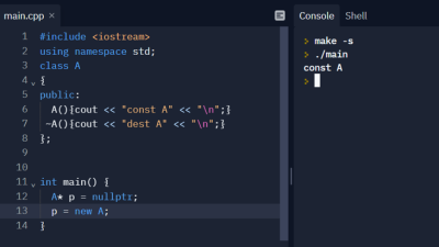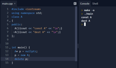 という事で、ちゃんとdeleteしなければデストラクタが呼ばれないのも一緒です。