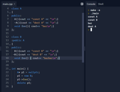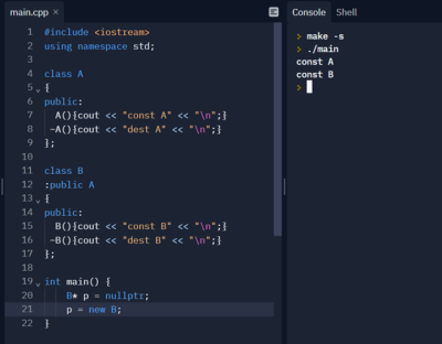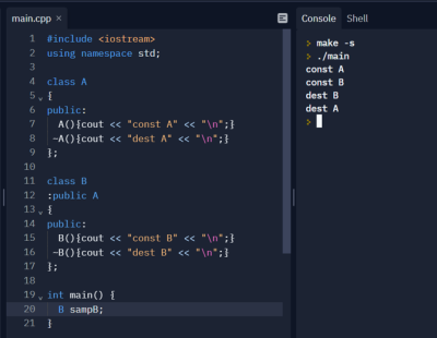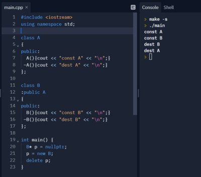 という事で、Bのデストラクタ、Aのデストラクタの順に呼ばれるようにするにはどうしたらいいか考えます。