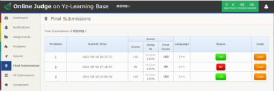 Share via Share via... Twitter LinkedIn Facebook Pinterest Telegram WhatsApp Yammer Reddit Teams最近の変更Send via e-Mail印刷パーマリンク × 最終提出物の確認(Final Submissions) 右のメニューからFinal Submissionsを選択すると、提出物(ソースコード)の最終確認が表示される。 すなわち、右メニュー部のAll Submissions(すべての提出物)の画面で、Final Submission(最終提出)としてマークされたものが表示される。 Fig. 1: 最終選択表示画面 ここで表示されているものが、最終提出物として登録される. 締め切りが来ると、Score BoardのランキングがFinal Submissionsで選択されたソースコードで決定される。 締め切りは、タイトルバーの右側に表示されている。(Figure 2) Fig. 2: game-engineer/classes/2021/online-judge/usage/final-submissions.txt 最終更新: 4年前by root