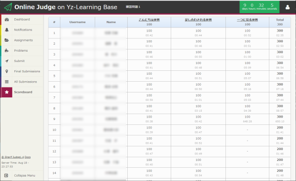 Share via Share via... Twitter LinkedIn Facebook Pinterest Telegram WhatsApp Yammer Reddit Teams最近の変更Send via e-Mail印刷パーマリンク × Score Board(スコアボード) いわゆるランキング表です。 皆様の目的は、このランキング表で上位にランキングされることです。 とは言え、大体解ける問題を出しているので、できれば全員100点で提出しましょう。 見方は、画面見れば分かるよね? Fig. 1: スコアボード game-engineer/classes/2021/online-judge/usage/scoreboard.txt 最終更新: 4年前by root