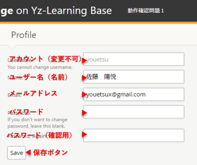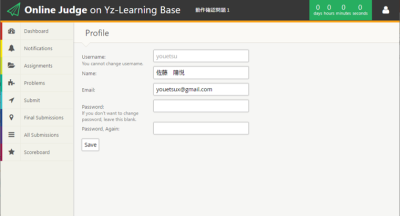 Share via Share via... Twitter LinkedIn Facebook Pinterest Telegram WhatsApp Yammer Reddit Teams最近の変更Send via e-Mail印刷パーマリンク × 設定 ユーザープロファイルの設定画面 設定画面を開くために右上の人型のアイコンをクリックする しゃしゃり出てきた,小さいウィンドウの“Profile”をclick こんな画面に移動する 各種設定を行う アカウント名は変更できません. ユーザー名(Name)には,自分の名前を漢字で入力 メールアドレス(Email)は,有効なEmailアドレスを入力 パスワードは,8文字以上,半角英数大文字小文字,記号などを交えて強いパスワードを設定する! game-engineer/classes/2021/online-judge/usage/setting.txt 最終更新: 4年前by root