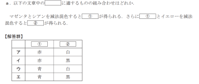 マゼンタとシアンを減法混色すると ①が得られる。 さらに、①とイエローを減法混色すると ②が得られる。