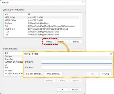 「新規(N)…」を押して、環境変数の新規作成ダイアログを出す。