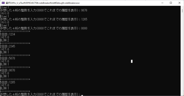 int main() { string answer = "0000"; //正答 string input = "0000"; //入力用 srand((unsigned int)(time(nullptr))); answer = MakeProblem(); cout << "THE HIT AND BLOW GAME" << endl; cout << "Let's Play the GAME!!" << endl; while (true) { cout << "予想した4桁の整数を入力:"; cin >> input; if (エラー処理で問題なかったら) { if(もし正解だったら) break;//どうせ正解したらループ抜けちゃうから、elseと書かなくてすむ //HIT数を数えて表示 cout << " Hit:" << HIT数カウント呼び出し << endl; //BLOW数を数えて表示 cout << "Blow:" << BLOW数カウント呼び出し << endl; } } //正解した時しかここにたどり着かない。 //ループの中で処理してもいいけど、今回はこんな感じにしてみました。 cout << "おめでとう!" << endl; cout << "答えは" << answer << "でした" << endl; return 0; }