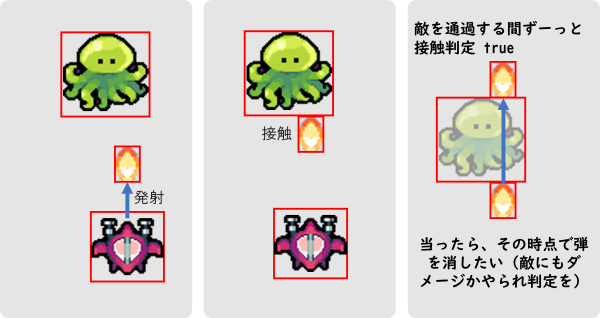 現在は、図のようにプレイヤーの弾丸が敵を通過している間毎フレームずっと弾と敵の当たり判定がtrueになっている。