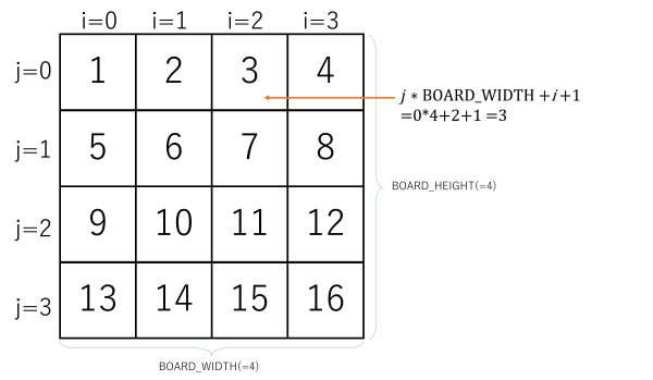 void InitBoard(Board& board) { for (int j = 0; j < BOARD_HEIGHT;j++) { for (int i = 0; i < BOARD_WIDTH; i++) { board.tile[iとjを使って0~15を順番にアクセス] = 左上から順に1~16までを代入; } } }